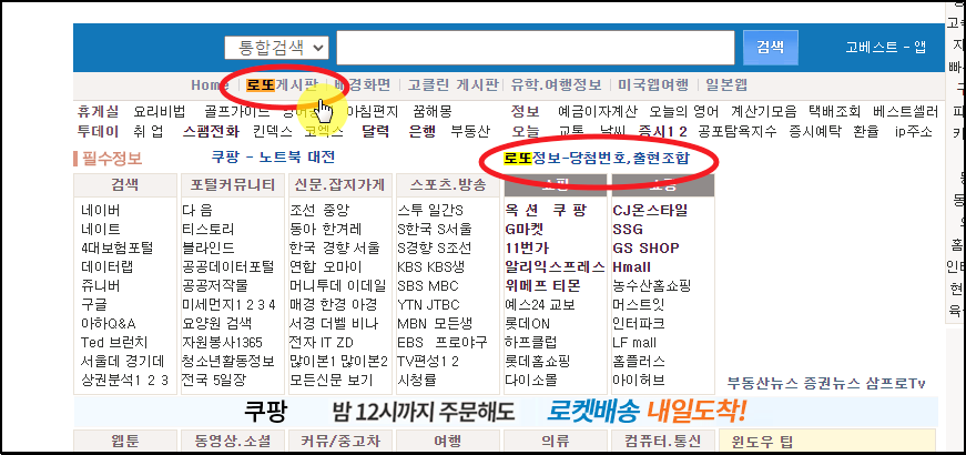 ▼ 사이트에 접속하면 메뉴에 있는 [로또 게시판]을 클릭해 주세요.