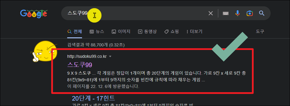 ▲ 그럼 방금 풀어본 것을 포함하여 굉장히 많은 스도쿠 문제모음을 만나보는 방법을 알려드리겠습니다.