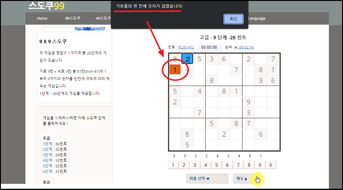 빈 공간에 잘못된 숫자를 넣으니 "가로줄의 빈 칸에 숫자가 겹쳤습니다." 문구가 뜨는데요. 이런 식으로 스도쿠의 기본 규칙에 어긋나면 바로 알림을 주기 때문에 조금 편합니다.