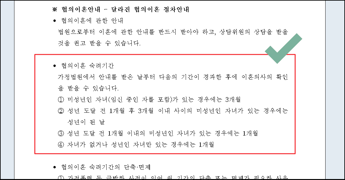 ▼ 서로 협의를 했다고 해서 바로 이혼 절차가 끝난 것은 아닙니다. 숙려기간이 있는데요. 서로 깊게 생각할 시간을 주는 좋은 제도입니다. 아무래도 이혼을 하게 되는 것이 서로를 위한 것일 수 있으나 서로를 힘들게 하는 것이기도 하는데요. 숙려기간에 대한 내용도 해당 양식을 통해 살펴보세요.
