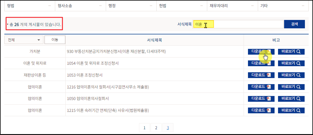 ▼ 자료실 페이지가 열리면서 계약, 행정, 상속, 형법, 손해배상 등 여러 가지 법률 관련 서식이 나타납니다. 여기에서 쉽게 이혼서류 양식을 찾기 위해서는 서식 제목을 "이혼"이라고 입력한 후 [검색] 버튼을 눌러주세요. 그럼 아래아 한글 파일로 다운 받을 수 있는 서식 리스트가 나타납니다. 여기에서 [다운로드] 버튼을 누르면 돼요. 로그인 없이 누구나 무료다운 받으실 수 있습니다.
