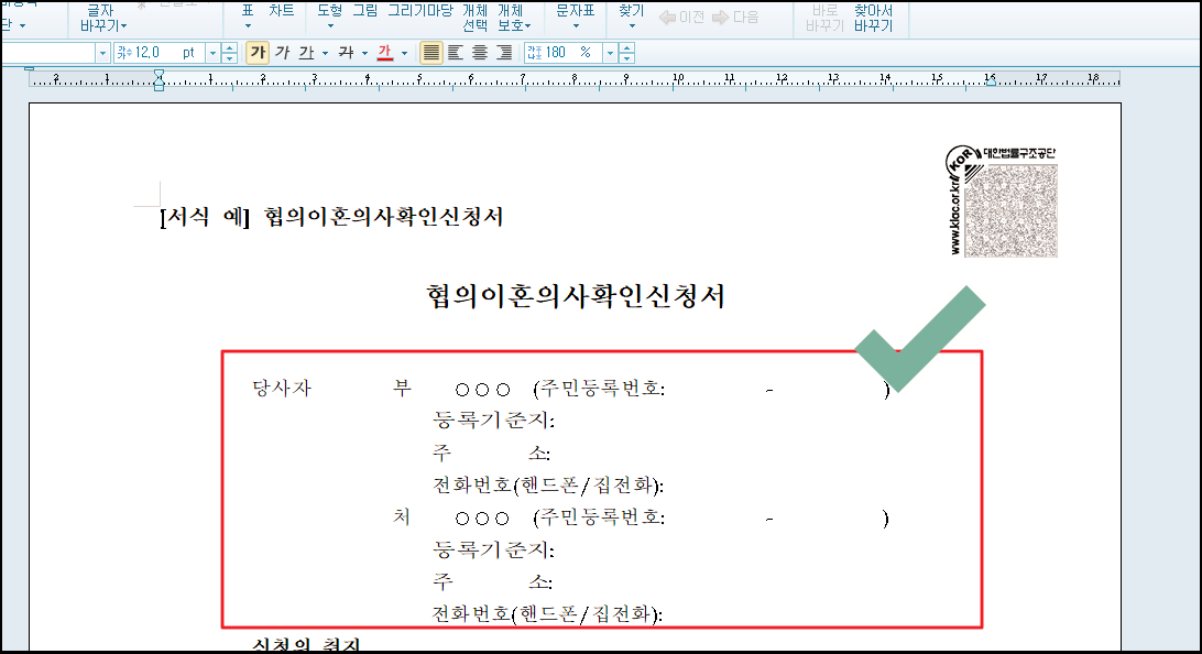 ▼ 이혼을 하게 되는 경우 가장 많이 이용하는 서류가 "협의이혼의사확인신청서" 입니다. 서로 합의가 된 경우에 작성하여 법원에 제출하는 양식인데요. 다음과 같이 각 항목의 빈 칸을 기재하기만 하면 됩니다. 성함, 주민등록번호, 등록기준지, 주소, 전화번호 등이 있죠. 바로 무료다운 받으실 수 있도록 아래와 같이 문서 파일을 첨부하였습니다.