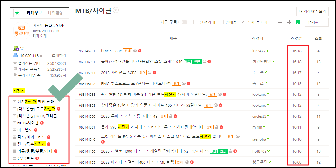 산악용, 로드용, 전기자전거, 미니 등 여러 가지 종류의 매물을 찾아볼 수 있도록 각자 직거래장터 게시판이 마련되어 있어서 이용하기에 편해요.
