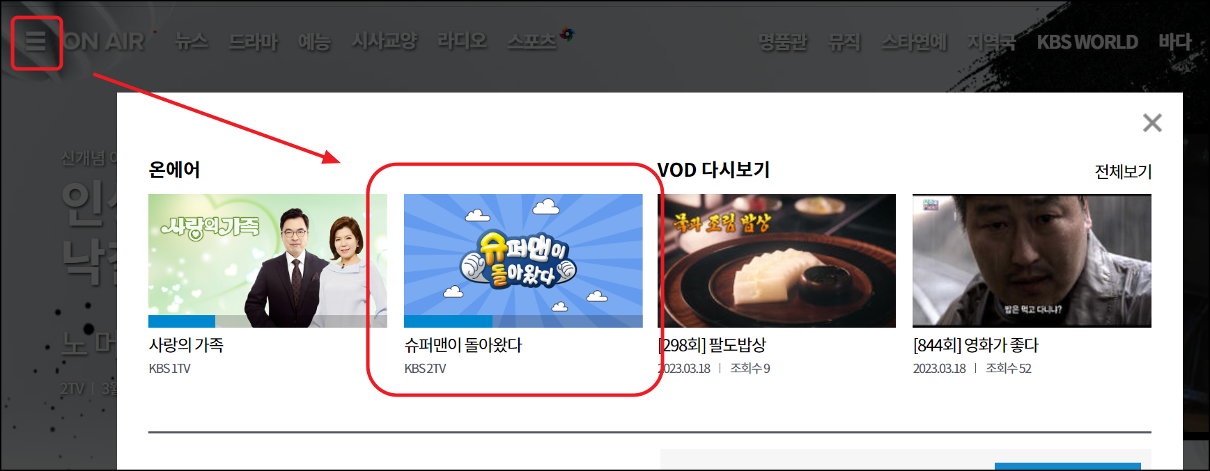 사이트에 접속하면 여러 가지 메뉴가 나타납니다. 여기에서 가장 좌측에 있는 [전체메뉴]를 선택해 보세요. 그럼 온에어 서비스가 나타납니다. kbs1과 kbs2 이렇게 2가지 선택이 가능한데요. 현재 지상파 kbs2 채널에서 인기 예능 프로그램인 "슈퍼맨이 돌아왔다."가 방영이 되고 있네요. 여기서 선택하면 바로 감상이 가능합니다.