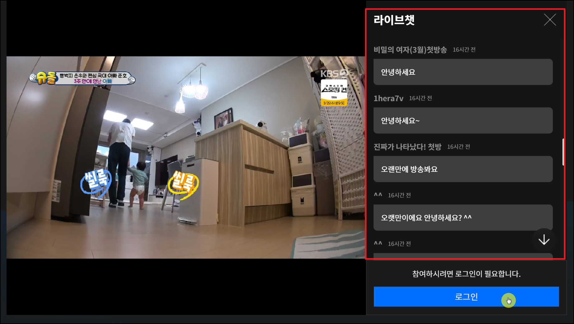 라이브챗의 경우에는 제가 자주 사용하는 기능인데요. 우리와 같이 kbs2 온에어 서비스를 이용하는 사람들끼리 채팅을 통해 대화를 할 수 있습니다. 혼자서 티비를 보는 것보다 다른 사람과 함께 볼 때 더 재미가 있으니 한 번 시도해 보세요. 참고로 채팅에 참여하고 싶으면 로그인이 필요하오니 이 점 참고해 주세요.