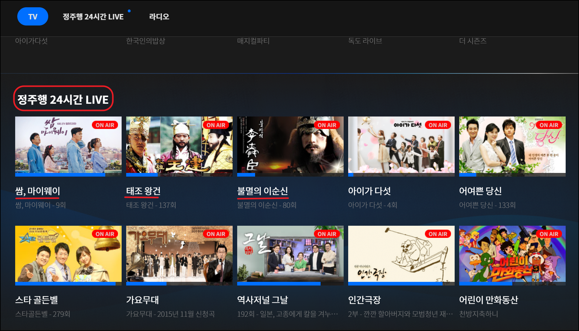 정주행 24시간 live 서비스도 이용해 보세요. 종영 되었던 프로그램을 처음부터 끝까지 볼 수 있습니다. 하나의 작품을 연속으로 보는 재미가 있는데요. 여기서 한 번 느껴보세요. 특히 드라마가 마음에 드네요. 과거에 kbs2 채널에서 큰 인기를 끌었던 드라마인 태조왕건, 쌈, 마이웨이 등이 있어요.