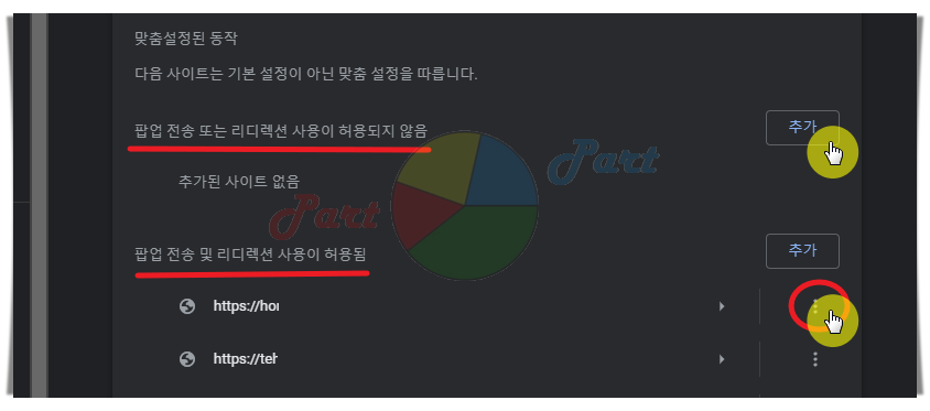 5. 개별 사이트에 대한 크롬 팝업 제어를 하는 방법을 알려드리겠습니다. 맞춤설정된 동작 부분에 있는 항목을 이용하면 되는데요. "허용되지 않음" 옆에 있는 "추가" 버튼을 누르면 특정 사이트에 대한 팝업 기능에 대한 "차단" 설정을 할 수 있습니다. 반대로 그 아래에 있는 허용 사이트에 추가를 하게 되면 "해제"가 되는 것이죠.