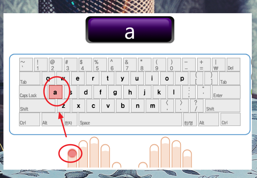 3. 우선 기본 자리를 익혀 보도록 하겠습니다. 보시는 바와 같이 맨 위에 있는 영어 스펠링을 보고, 키보드에 맞는 자판을 클릭하면 됩니다. 이 때 주의해야 될 점 있는데요. 각 버튼마다 사용해야 손가락이 따로 있습니다. 예를 들어 "a"의 경우에는 새끼손가락을 사용하여 눌러야 합니다.