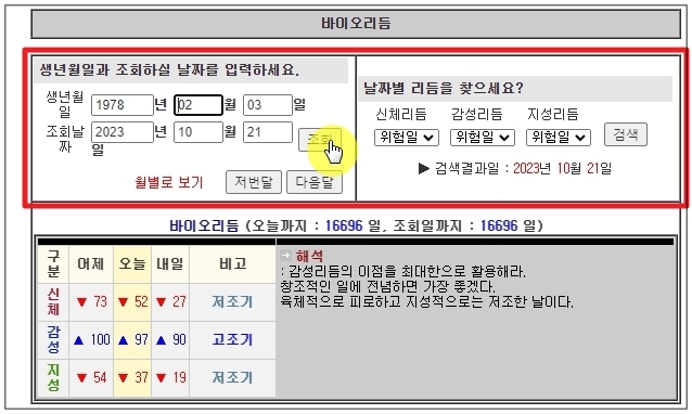 3. 일단 사이트 메인 화면에 있는 바이오리듬을 한번 보실까요. 생년월일을 가지고 조회하는 것인데요. 그런 의미에서 사주팔자와 어느 정도 관련이 있다고 생각됩니다. 자신의 신체 감성 지성 리듬을 간단히 확인해 보세요.