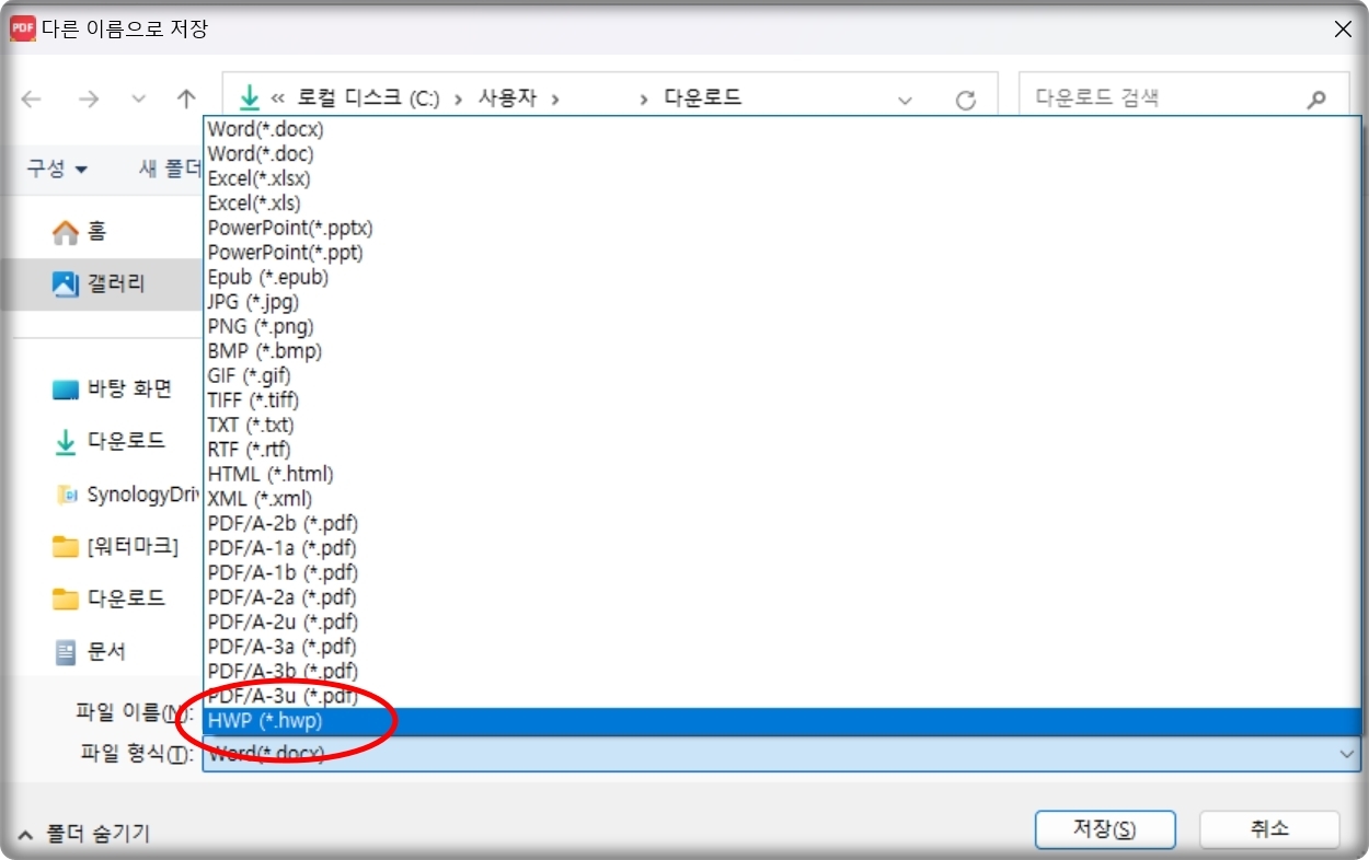 대상이 되는 문서를 선택한 다음에 확인 버튼을 누르면 어떤 포맷으로 저장할지 선택하는 단계로 넘어가게 되는데요. 여기에서 한글 포맷으로 변환을 하려면 hwp를 선택하면 됩니다.