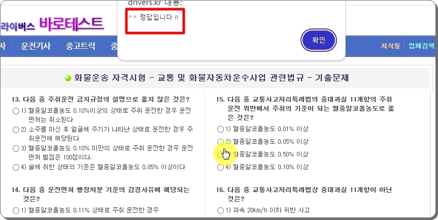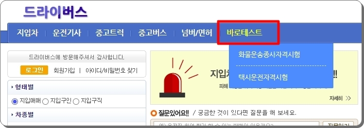 드라이버스 홈페이지에 접속하면 메뉴에서 가장 우측에 있는 "바로 테스트"를 선택해 주세요, 그럼 두 가지 하위 메뉴가 나타나는데요. 여기에서 화물운송종사 자격시험을 선택하면 됩니다.