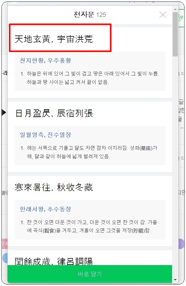우리가 앞서 쓰기 자료를 통해 본 내용과 동일한데요. 여기서 깊이 있게 배우고 싶은 문장을 클릭해 보세요. 그럼 문장에 속한 각 한자에 대하여 자세하게 알아볼 수 있습니다.